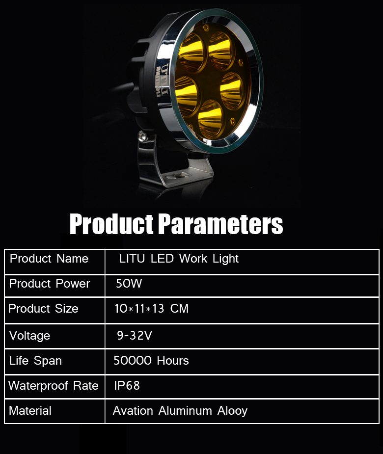 Lumen Output: 5000 Lumens Voltage: DC 9~36V Wattage: 50W Waterproof: IP67 rated Working Temp: -45 ~ 55℃ Lifespan: 50,000 Hours Dimensions: Length: 99mm*99mm*30mm *mounting brackets not included Warranty: 1 Year