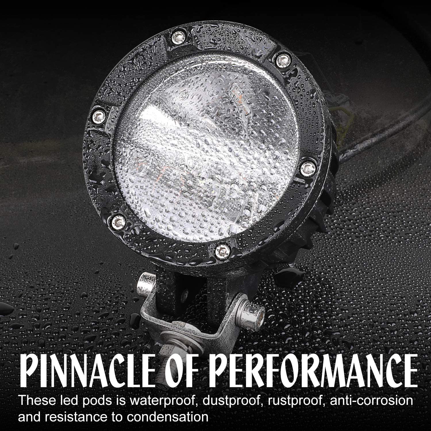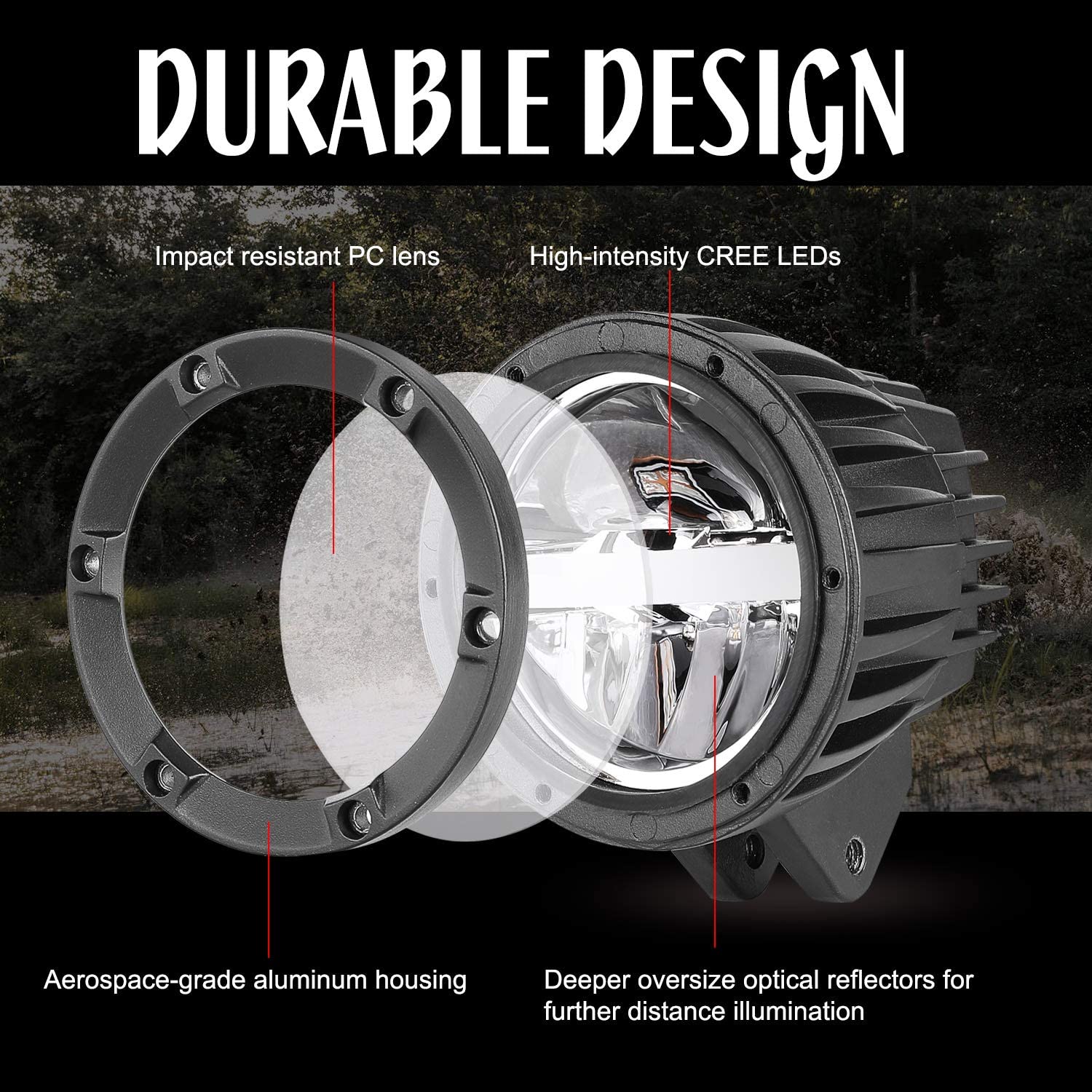 * DURABLE DESIGN - Built with durability in mind, high quality powder coated black aluminum housing and unbreakable PC lens ensure IP68 rated protection to stand up the toughest condition. Each lights assembly undergoes a rigorous quality control process before leaves the factory and tested to ensure completely functional of waterproof,rustproof, dust-proof, impact resistance and anti-corrosive. Latest circuitry and heat sink maintain temperature balance are guaranteed to serve you for many years.
