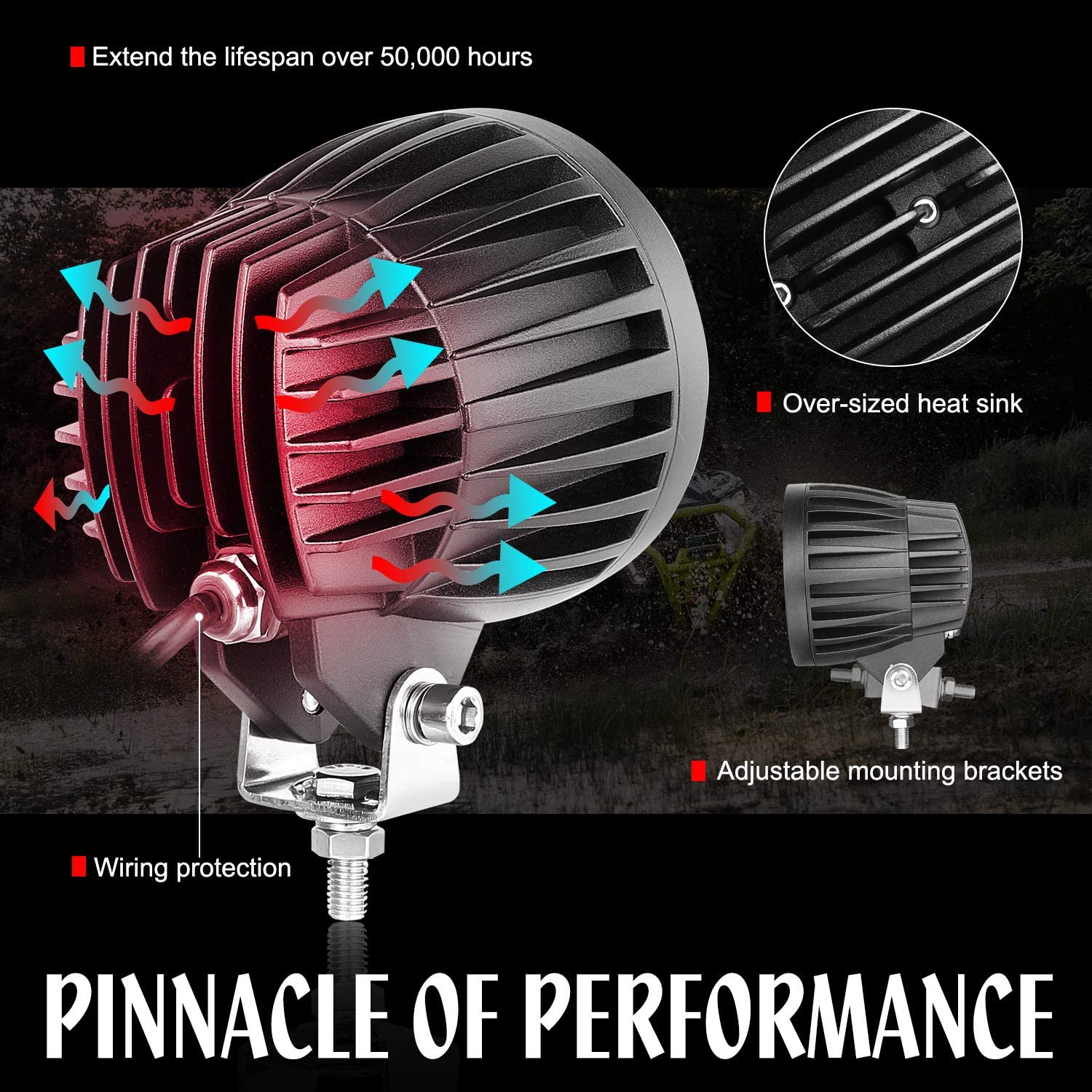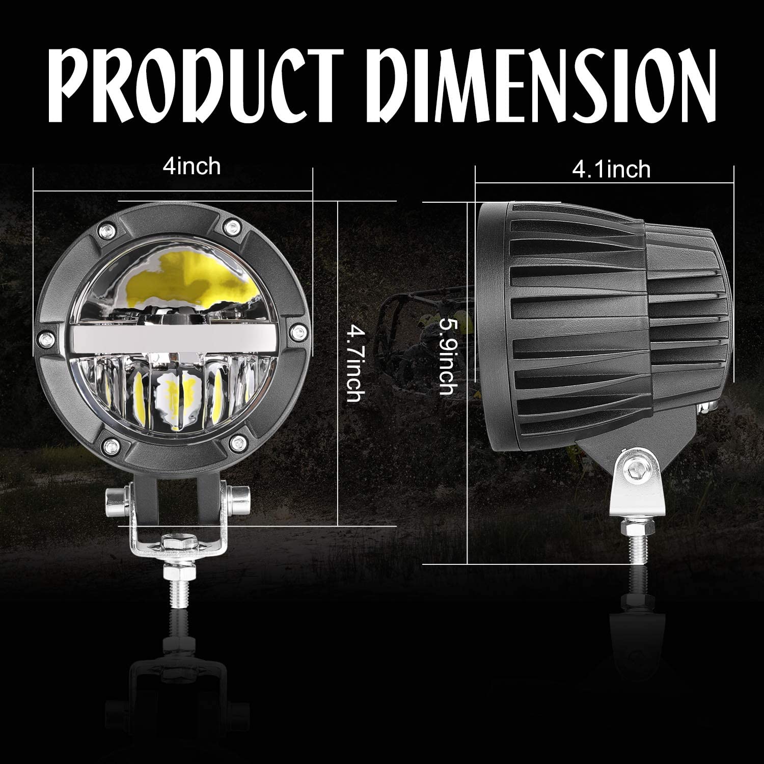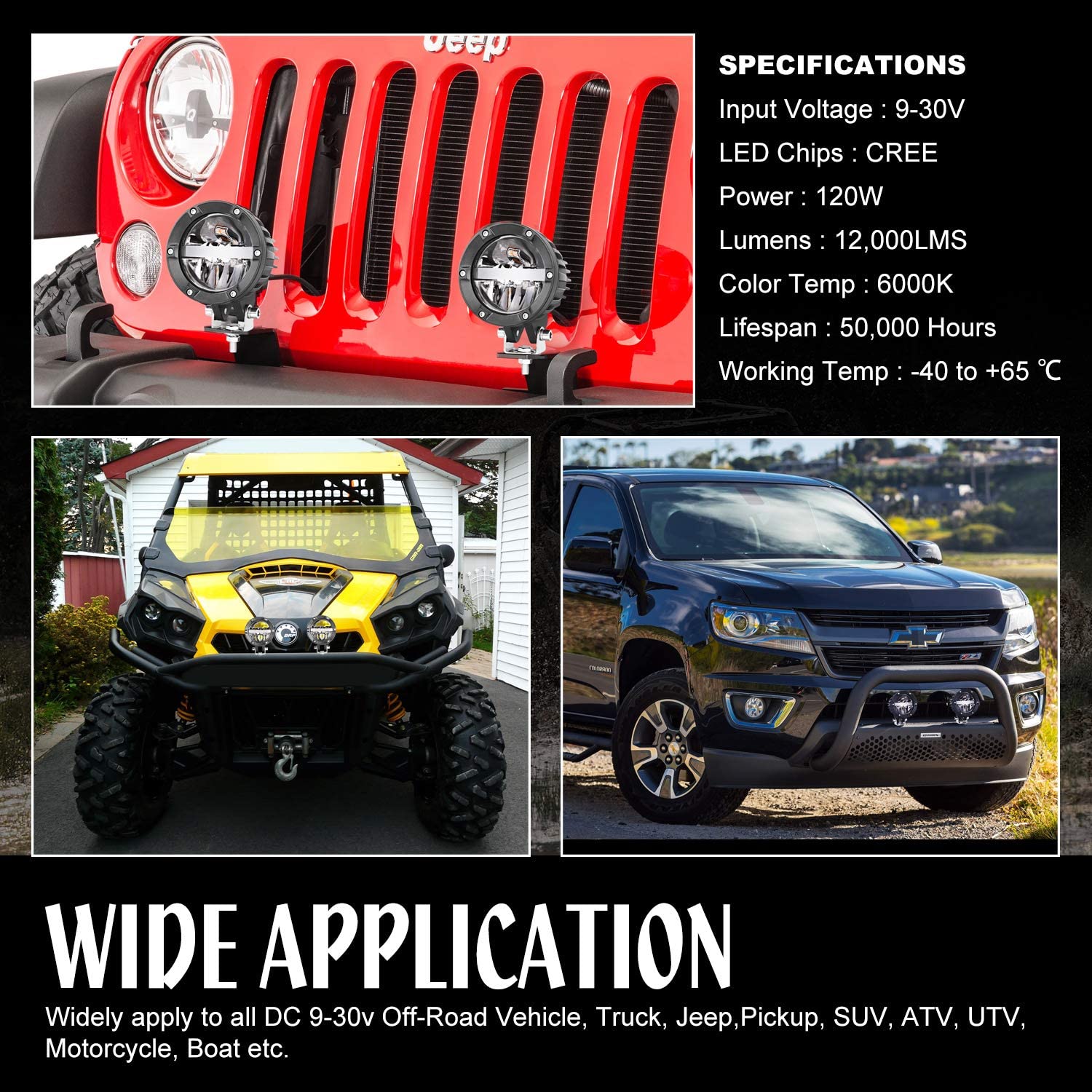 * WIDE APPLICATION - Widely used on power sports (UTV, ATV, RZR, Dune Buggy, Sand Rails), Jeep, SUV, Pick-up, Ford, mining, agriculture (Trailer, Forklift, Excavator, Dozer, Tractor), or fire and rescue, these LED Driving Lights are perfectly fit for any application that requires reliable and efficient lighting.